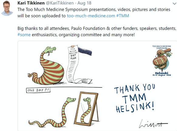 Diese vier Fragen, vorgestellt von Choosing Wisely Canada, spielten 2018 im Rahmen zweier Symposien, Too Much Medicine in Helsinki (Abb. 1), und der 6. jährlichen Annual Preventing Overdiagnosis Konferenz in Kopenhagen eine wichtige Rolle. Über 600 der weltweit führenden Forscher und Denker im Bereich der Vermeidung von Überdiagnosen sind im August für zwei Wochen zusammengekommen. Dabei ging es darum, die Probleme herauszuarbeiten die durch medizinischen Übereifer verursacht werden und gleichzeitig evidenzgestützte Praktiken zu definieren die in der Lage sind, Schäden einzudämmen, die durch ein Zuviel an Medizin verursacht werden.