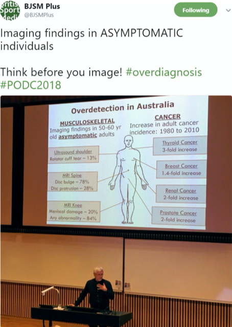 Dank rapider technischer Fortschritte sind wir zunehmend in der Lage, Krebserkrankungen und anatomische Abweichungen, sowie Risikofaktoren für Krankheiten wie Hypertonie oder erhöhte Cholesterinwerte aufzuspüren. Screeining hilft uns, Anomalien geringen Risikos Früher zu diagnostizieren, lang bevor sie Symptome verursachen oder behandelt werden müssen (wenn überhaupt). Während es sich bei der Überdiagnose von Brust-, Prostata- und Schilddrüsenkrebs um gängige Beispiele handelt, existieren für bildgebenden Verfahren des Bewegungsapparates ähnliche Bedenken (Abb. 6).