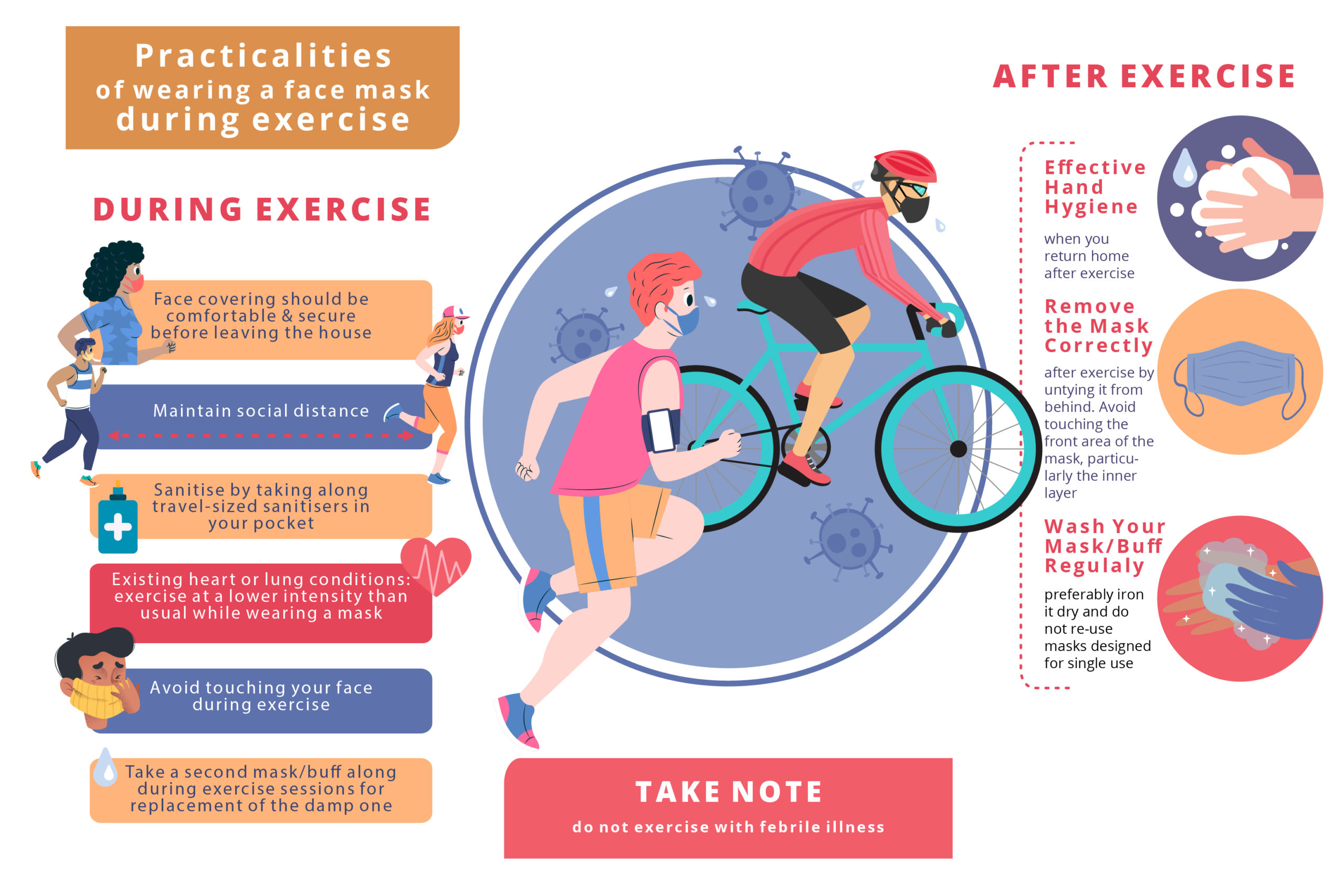 - This must be accompanied by social distancing during exercise and effective hand hygiene when you return home.