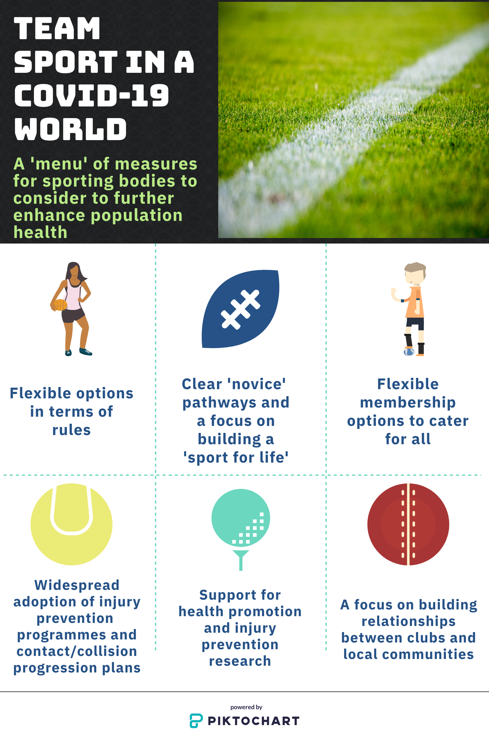 A huge amount of interdisciplinary teamwork has produced COVID-19 sport-specific return-to-training guidelines, demonstrating monumental amounts of flexibility and innovation(14). As such, we know that sports have the ability to adapt (dramatically in certain cases, such as in collision sports), and this could extend to also embrace the important pre-pandemic challenges threatening the future of traditional team sports.