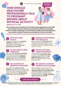 A new scoping review aimed to understand what is known about how healthcare professionals communicate about physical activity during pregnancy in the UK. Despite well-established guidelines and compelling evidence for physical activity benefits during pregnancy, the research reveals a troubling disconnect between what pregnant women need and what they’re receiving in terms of physical activity communication from healthcare professionals. This blog summarises the review’s key findings and implications for practice.