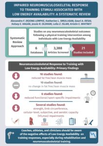 Low energy availability, or an imbalance between nutritional intake and physical activity, is a common health concern among male and female athletes. Low energy availability is known to negatively affect muscle strength, athletic performance, and overall neuromusculoskeletal health. Recent studies have begun to show that low energy availability may also reduce expected neuromusculoskeletal responses to physical exercise and training (for example, minimal strength gains in response to resistance training). This systematic review sought to compile the existing evidence about neuromusculoskeletal responses to training among individuals with low energy availability.
