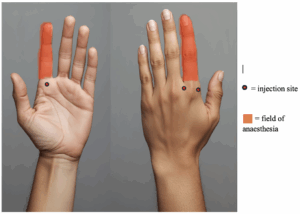 Figure 11. Image demonstrating the injection site and anaesthetic field for ring blocks.