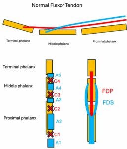 Figure 1. Anatomy of extensor and flexor tendons, alongside some common injuries