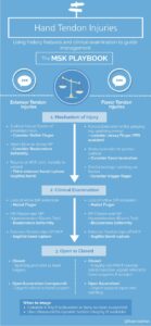 - Early recognition of the injury mechanism can help to guide clinicians on whether this is a flexor or extensor tendon injury and timelines for healing
