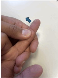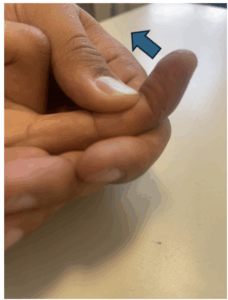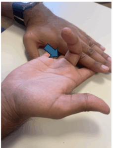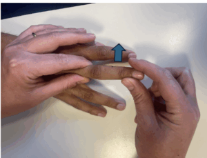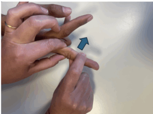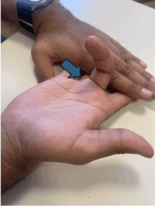 The clinician will ask the patient to move their finger to feel for any locking or catching. The clinician will feel the base of their finger or thumb to check for a palpable lump. The clinician may also try to passively extend or flex the finger to see how the tendon moves.