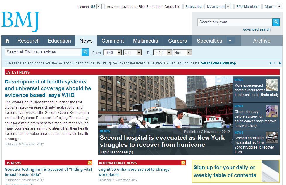 Our first email was from a reader who could not locate obituaries. He had a point. Obituaries are very popular, particularly with UK readers, and although the latest ones display on our print table of contents (and a similar one showing all articles posted online in the last seven days) they did not have a presence on the homepage or any of our five channels—research, education, news, comment, and multimedia. They now have their own slot on the comment channel (see left). In 2013 we hope to make it easier for readers to submit obituaries online.