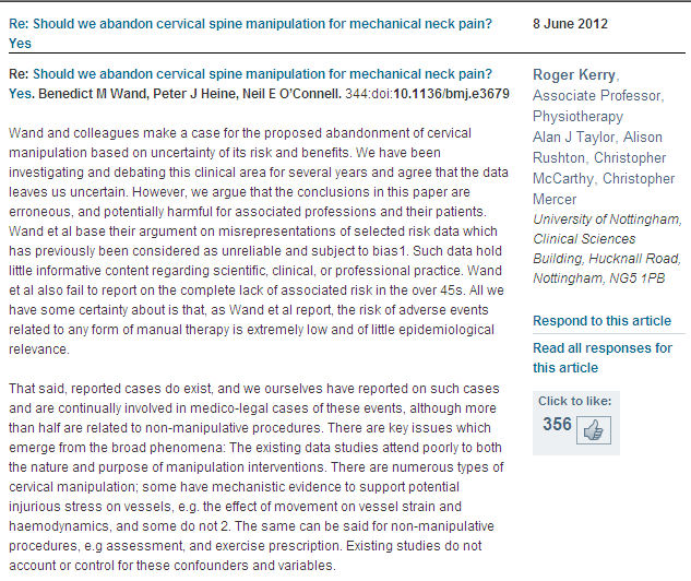 “unlike” rapid responses. We were surprised how many readers chose to do this, but felt that perfectly good and well argued responses were attracting negative votes, presumably because readers did not agree with the point of view expressed. We were worried that this might put people off submitting responses, so we removed negative voting (see right). We also felt this was more consistent with how other social media websites work. On Facebook, for instance, you cannot “unlike” a post.