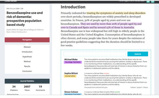 The team took a BMJ paper published in 2004 about benzodiazepine use and risk of dementia. As you can see from the image above, it lists views, comments, and citations on the left, along with a clear way of navigating the paper. The article is on the right, using colour-coded links to cluster different professional groups.