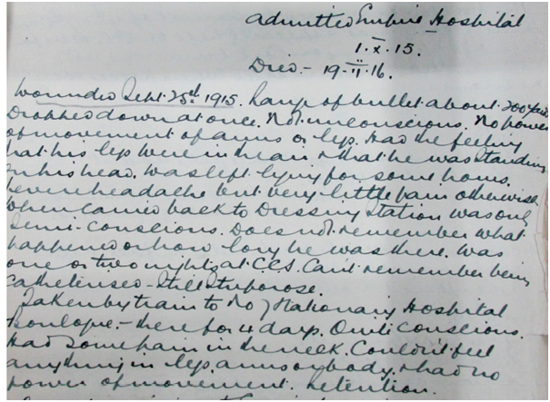 Captain French was wounded on 25 September 1915 while fighting with the 1st Battalion Royal Welch Fusiliers during the Battle of Loos. A bullet fired from about 200 yards away hit him in the back of the neck and he fell to the ground. He did not lose consciousness, but he developed a severe headache and lost the power of movement in his arms and legs. He was transported to a Casualty Clearing Station, where he remained for one or two nights, and was then taken by train to No 7 Stationary Hospital in Boulogne, where he stayed for 4 days. He was conscious but had some pain in the neck and could not feel anything in his legs, arms, or trunk and had no power of movement below the neck.