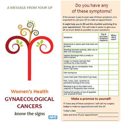 So we designed an information leaflet that addressed some of these issues. It provided information about possible symptoms of gynaecological cancer and a checklist to help women record their symptoms and make a plan to visit their GP. It reassured women that their doctor would be happy to see them, and that the symptoms were unlikely to be serious. It addressed the issue of embarrassment and reminded women they could ask to see a female doctor.