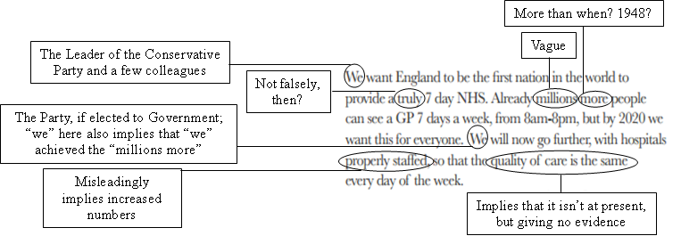 The relevant text about the NHS in the body of the 2015 Conservative Party’s manifesto is reproduced below, with annotations based on the observations about weasel words that I made in last week’s blog. There’s no mention of a contract. Nor is a contract mentioned in a recent written statement promising “to help create the safest, highest quality health and care services 7 days a week, including improved early diagnosis, services and outcomes for cancer patients”. No mandate then. Later in the manifesto the following statement appears: “We are deeply proud of our NHS staff”. I haven’t found any evidence of that either.
