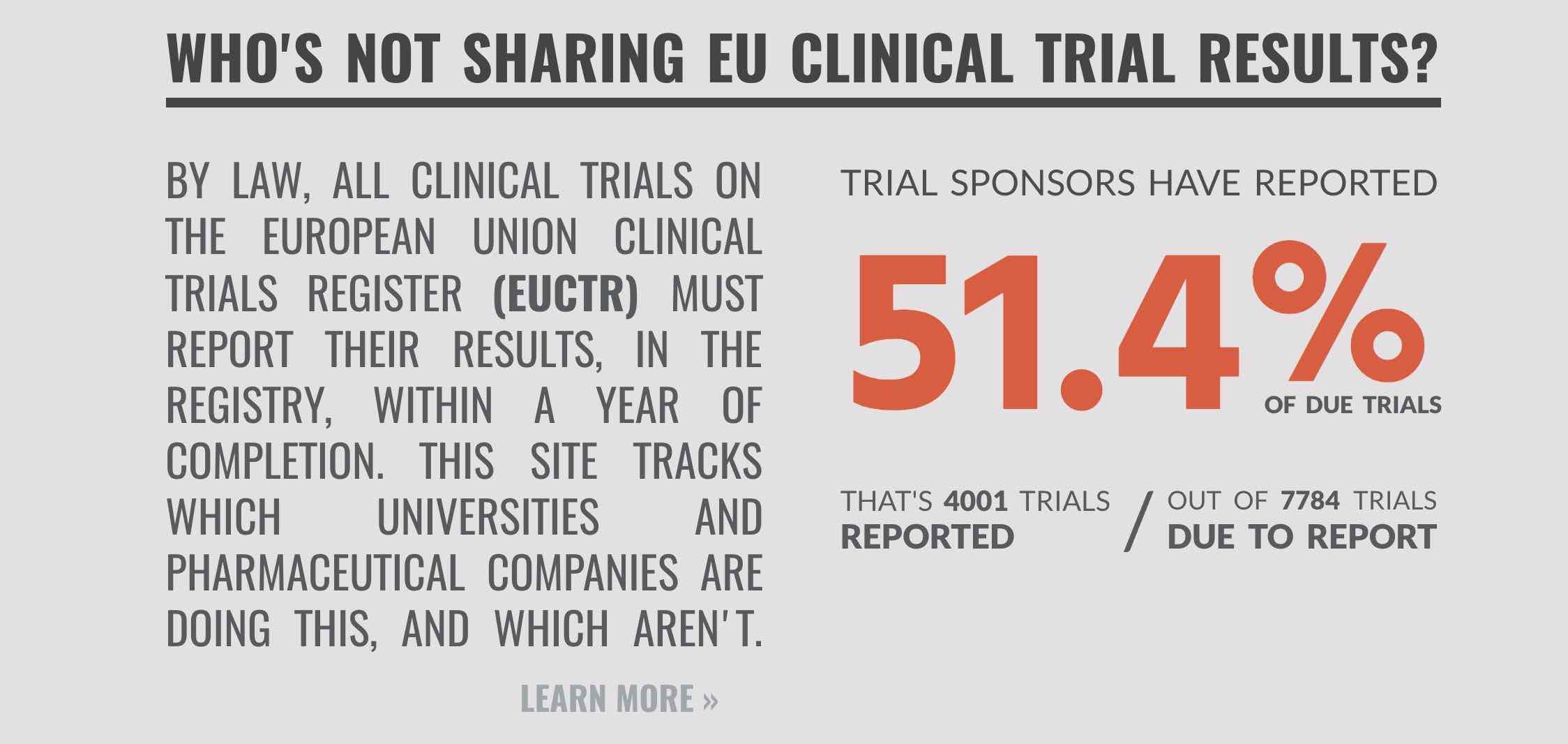 Since 2014 the European Commision has required that all trials in the EU clinical trials register have to post results within 12 months. Here are today’s results from the eu.trialstracker.net/ – only 51.4% of trials sponsors have reported – I’d, yet again, call that failing.