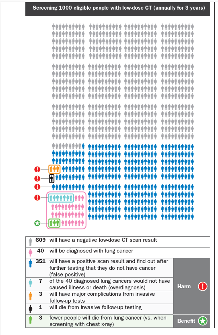 A total of 73 patients (3.5% of all patients screened) had suspicious findings and underwent further evaluation – 31 (1.5%) had lung cancer. They concluded that implementation may stress the capacity of radiology services, it will require additional training for a host of staff, will lead to large numbers of eligible patients and require substantial clinical effort for both patients and staff. They also stress there is a need to learn more about decision aids and optimal ways to use them in lung cancer screening.