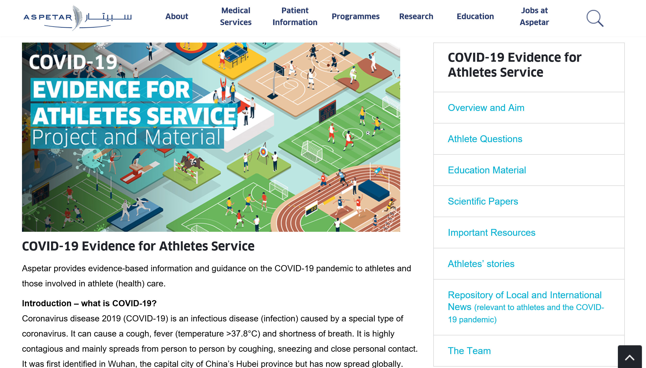 Aspetar, a specialist sports medicine and orthopaedic hospital serving many professional and recreational athletes in Qatar, realised that the sudden disruption in normal clinical services had led to questions in the minds of athletes and coaches related to the pandemic. Therefore, we rapidly implemented the Aspetar COVID-19 Evidence for Athletes Service with the aim to provide evidence-based information and guidance on the COVID-19 pandemic to athletes and those involved in athlete (health)care. We describe here how we implemented this service, how we run it and the lessons we have learnt so far.