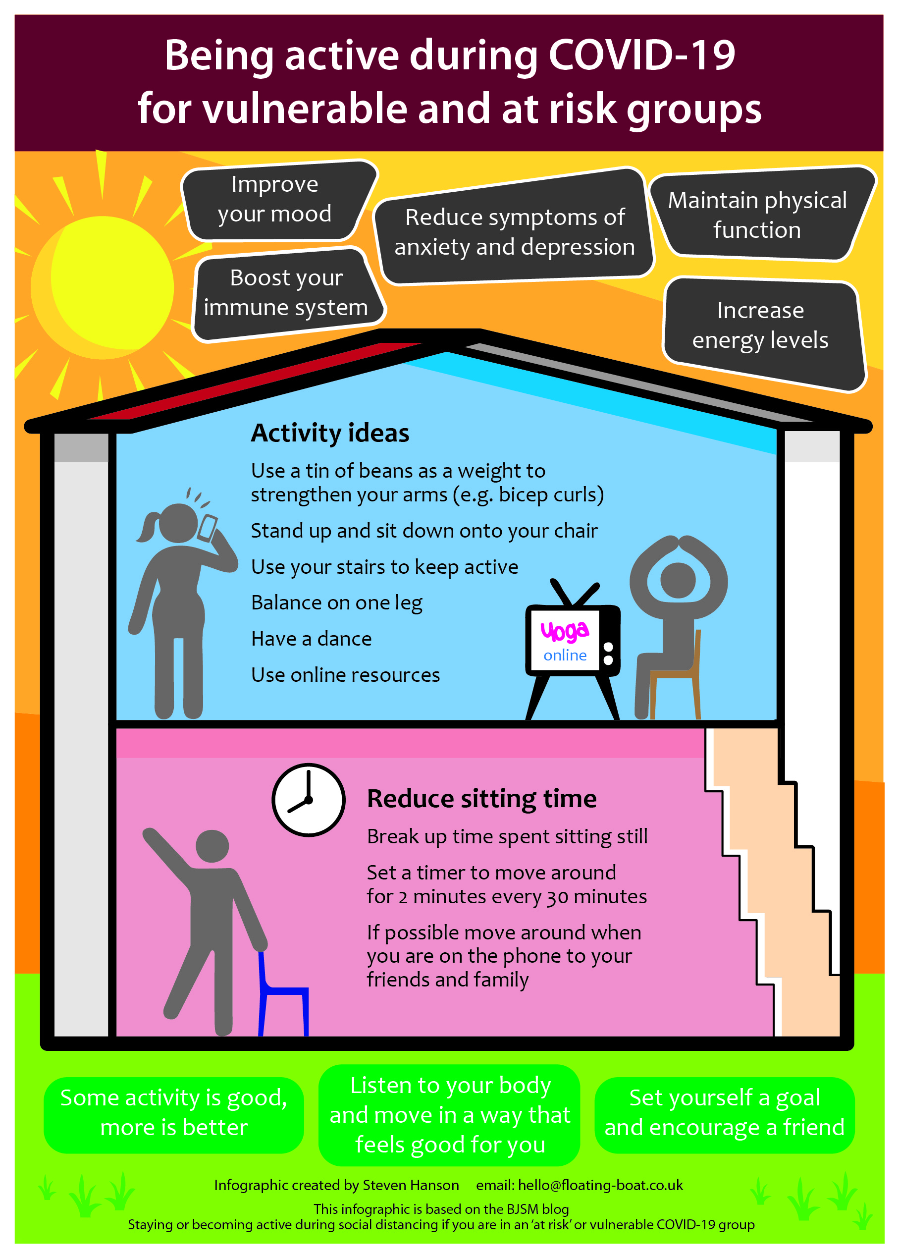 The aim of the infographic is to give people classed as ‘at risk’ or vulnerable ideas about how to remain safely active during COVID-19 and to motivate them to do so. We hope to achieve this through increasing awareness and knowledge of physical activity benefits, and by improving confidence to be active during this pandemic.