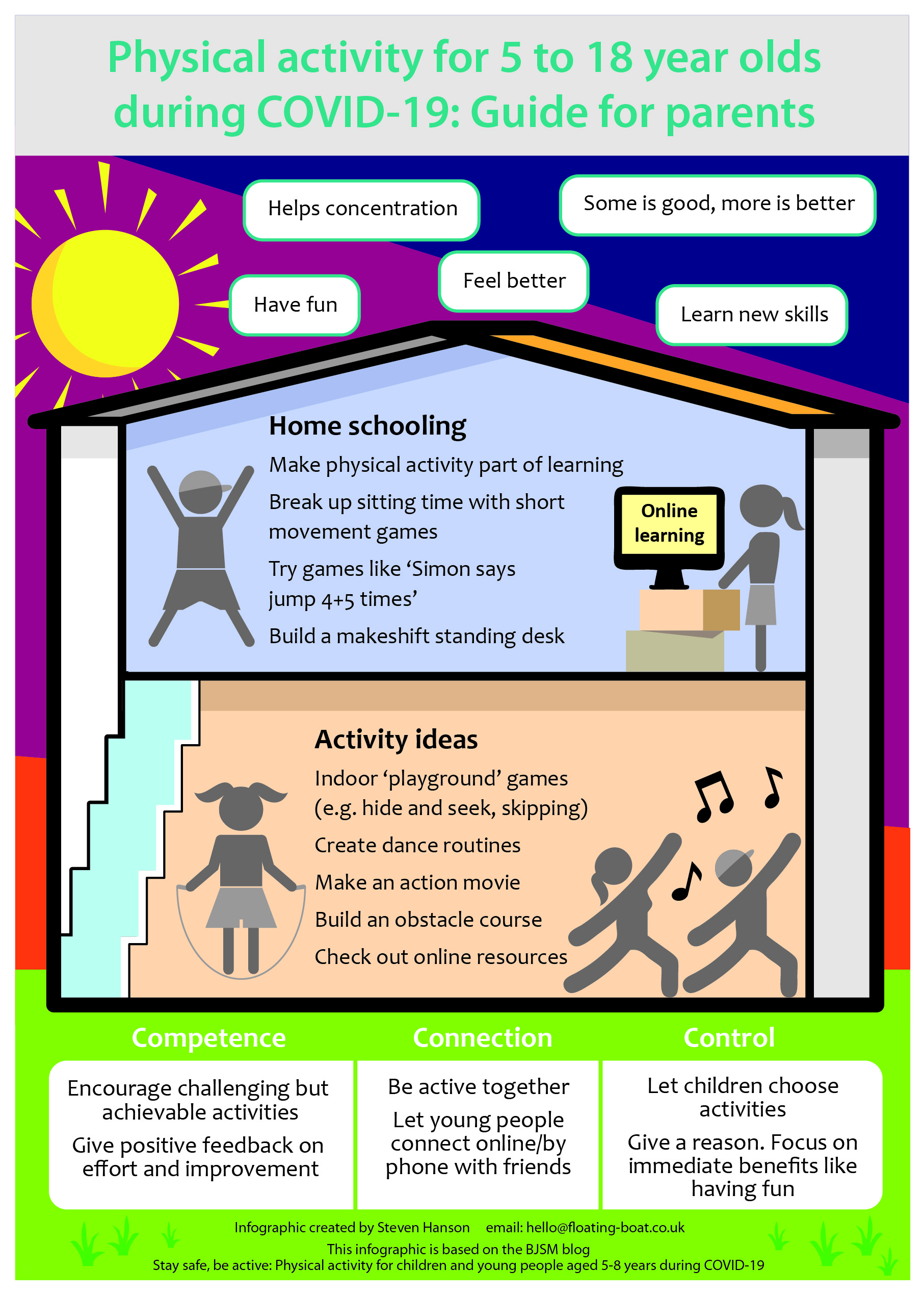 Covid-19 presents many challenges and anxieties. For parents and carers of school-aged children (young people), daily lives are barely recognisable. We are attempting to juggle work, life and schooling from home, while trying to keep everyone happy. The benefits of physical activity for young people are widely recognised, and during COVID-19, moving more and sitting less is very important to help families maintain physical and mental health. Being confined to home means that young people, who are used to school P.E., after school activities, active travel, organised sport and outdoor play, have to find a ‘new normal’. Screen use, which is mainly sedentary, has likely increased because of the switch to online education, entertainment and ‘babysitting’ services for overstretched parents.