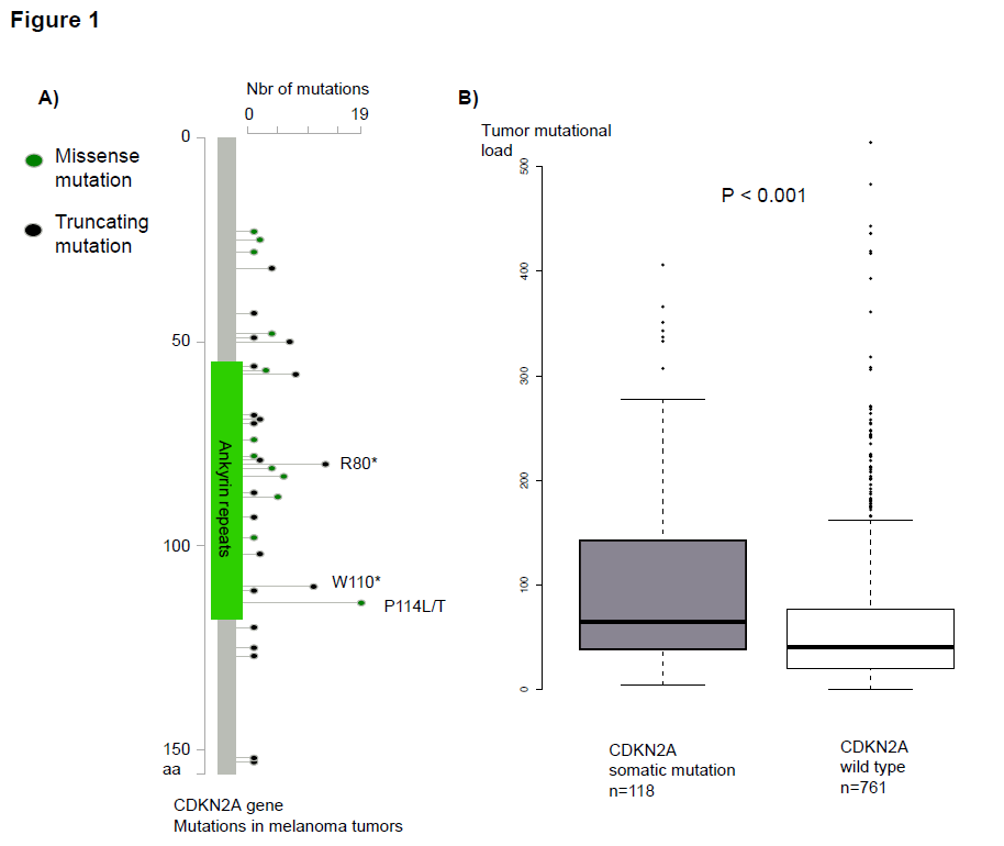 Inherited mutation in the tumor suppressor gene CDKN2A is one of the strongest known risk factors for melanoma of the skin. Moreover, carriers have been found to have poor melanoma-specific survival. In this study, responses to novel immunotherapy agents (PD-1 and CTLA-4 inhibitors) in CDKN2A mutation carriers with metastatic melanoma were evaluated. Eleven of nineteen affected carriers (58%) responded to the immunotherapy, six with complete responses (32%) which are significantly higher frequencies than observed in clinical trials (37% and 7%, respectively). Further, we report that melanoma tumors with CDKN2A mutations have significantly higher burden of mutations.CDKN2A mutated melanoma patients may have improved immunotherapy responses due to increased tumor mutational load, resulting in a stronger antitumoral immune responses. (By Dr. Hildur Helgadottir, https://jmg.bmj.com/content/early/2018/10/05/jmedgenet-2018-105610.1 )
