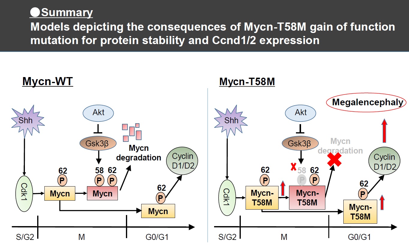 We identified a heterozygous missense mutation (c.173C>T; p.Thr58Met) in the MYCN gene in an individual with megalencephaly, ventriculomegaly, hypoplastic corpus callosum, intellectual disability, polydactyly and neuroblastoma. The mutation occurred at Thr58 phosphorylation site essential for ubiquitination and subsequent MYCN degradation. In vitro and in vivo analysis suggested that this mutation stabilized and accumulated MYCN protein and induced prolonged CCND1 and CCND2 expression, which promoted neurogenesis and impaired neuronal cell migration. This is the first report of a germline gain-of-function mutation in MYCN leading to a novel megalencephaly syndrome contrary to Feingold microcephaly syndrome caused by a loss-of-function mutation in MYCN. (By Dr. Kohji Kato, https://jmg.bmj.com/content/early/2018/12/20/jmedgenet-2018-105487 )