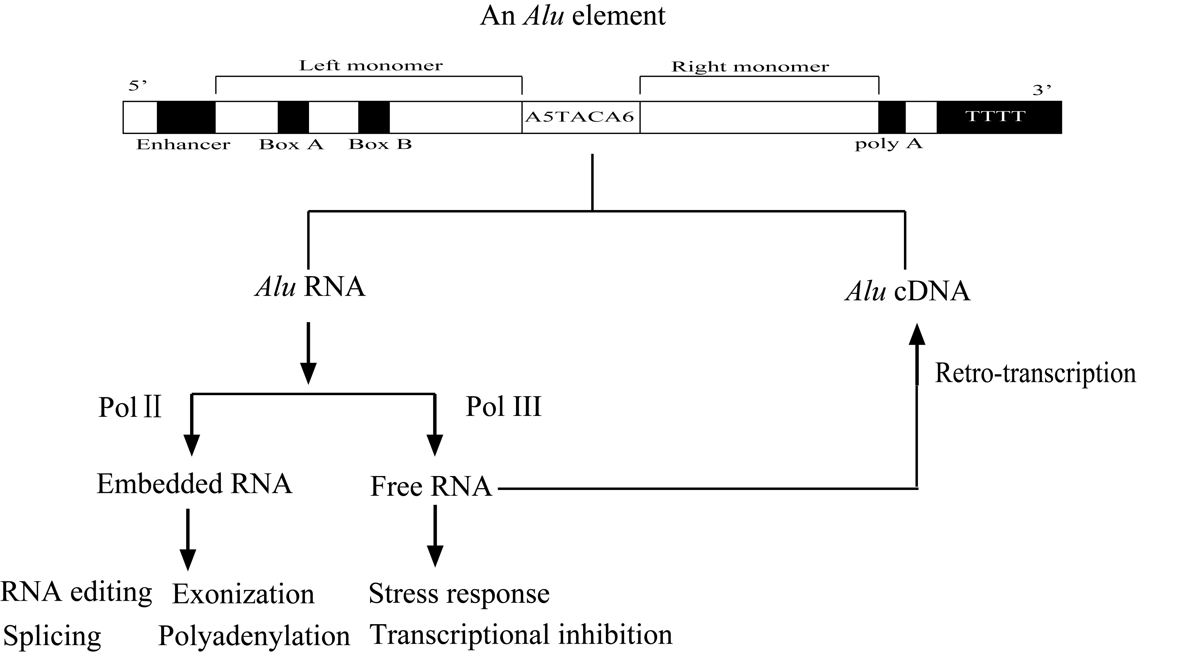 This article summarized the DNA genetic modification and RNA regulation mechanism of Alu elements in tumor development, and discuss the latest clinical applications, so as to put forward advices for subsequent studies and summarize new ideas for tumorigenesis and further gene therapy. Alu elements are abundant repetitive sequence, which account for 10% of the human genome. Genetic modification of tumorigenesis by Alu elements is mainly reflected in insertion, recombination, methylation at the DNA level, and the following events like splicing, exonisation or polyadenylation. Alu RNA also plays an essential regulatory role in tumorigenesis. Free Alu RNA can act as a transduction medium for inflammatory factor-related signaling pathways, while embedded Alu RNA in the 3′ UTRs of mRNA regulates long non-coding RNA, microRNA or circular RNA. In addition to research on mechanisms, Alu elements, especially Alu DNA concentration and integrity is widely used for tumor diagnosis, therapeutic effect monitoring and prognosis prediction. Despite this, there are some challenges in clinical application including standardization, innovation in detection technology and so on. (By Yun Jiang, https://jmg.bmj.com/content/early/2019/03/09/jmedgenet-2018-105761 )