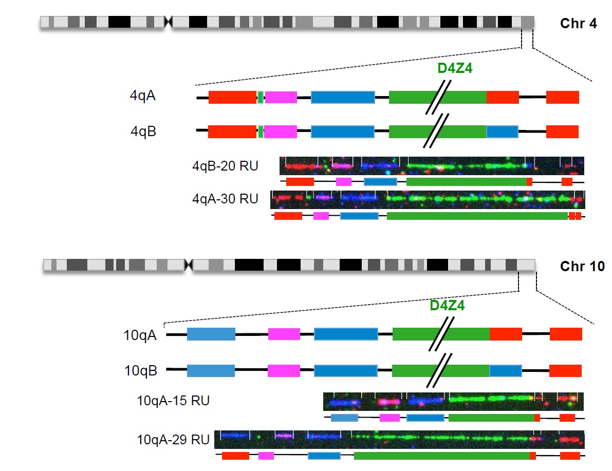 Molecular diagnostics of FSHD remains complex for approximately 20% of patients, posing difficulties in genetic counseling. To overcome these current limitations, we have developed a molecular combing-based method allowing a precise bar coding of the 4q35 locus linked to the disease and 10qter region, which is highly homologous. By exploring a thousand cases with this approach, we have increased FSHD diagnostic rate and identified atypical genomic features in more than 7% of patients.