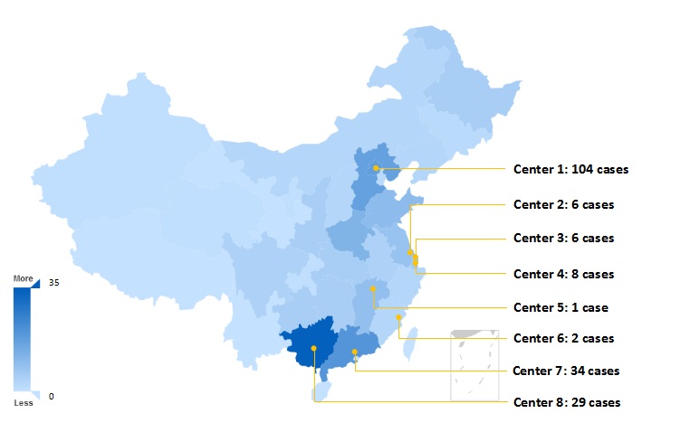 Distribution of the enrolled subjects with 5α-Reductase-2 deficiency from multiple centers in China (Center 1 to Center 8)