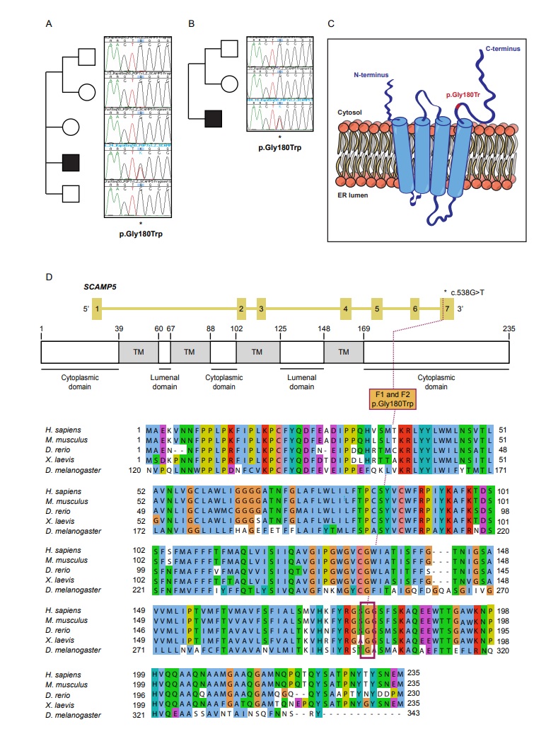 (A) and (B) show the pedigree and Sanger chromatograms for families 1 and 2 respectively. (C) is a graphical representation of the SCAMP5 protein showing the cytoplasmic location of the p.Gly180Trp variant. (D) shows the exons and domains structure of SCAMP5 and the aligments across differents species of the protein sequences.