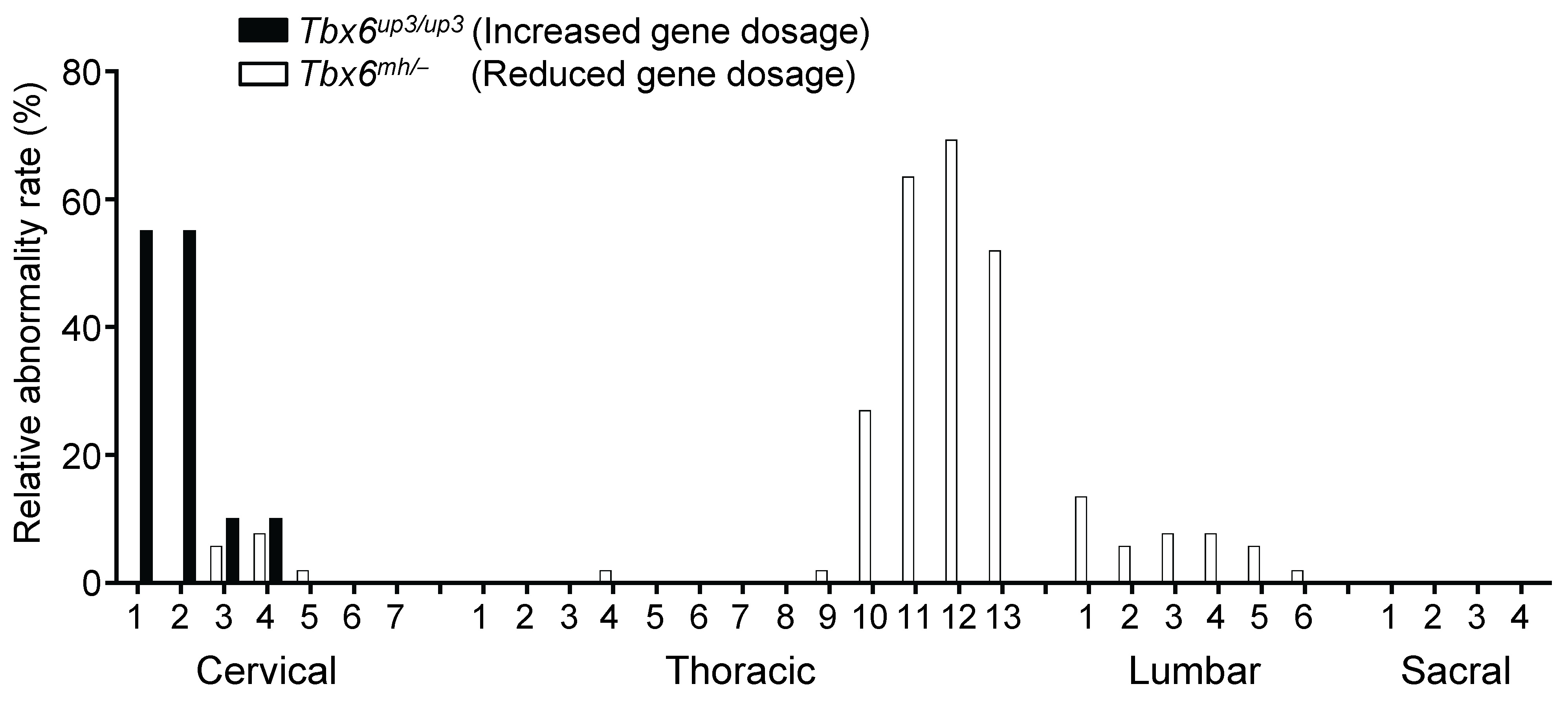 We previously reported that the human 16p11.2 BP4-BP5 deletion and its associated TBX6 dosage reduction caused congenital vertebral malformations (CVMs) in thoracic and lumber vertebrae. Here we reveal genetic contributions of the reciprocal 16p11.2 BP4-BP5 duplication to cervical CVMs. The spinal assessments in seven duplication carriers showed that four presented characteristics of cervical CVMs. We also generated the mouse model that functionally mimics the TBX6 dosage of duplication carriers. Remarkably, 60% of the mutated mice manifested with cervical CVMs. Our findings in humans and mice consistently support that an increased TBX6 dosage contributes to the risk of developing cervical CVMs. (By Professor Feng Zhang, https://jmg.bmj.com/content/early/2019/12/30/jmedgenet-2019-106333 )