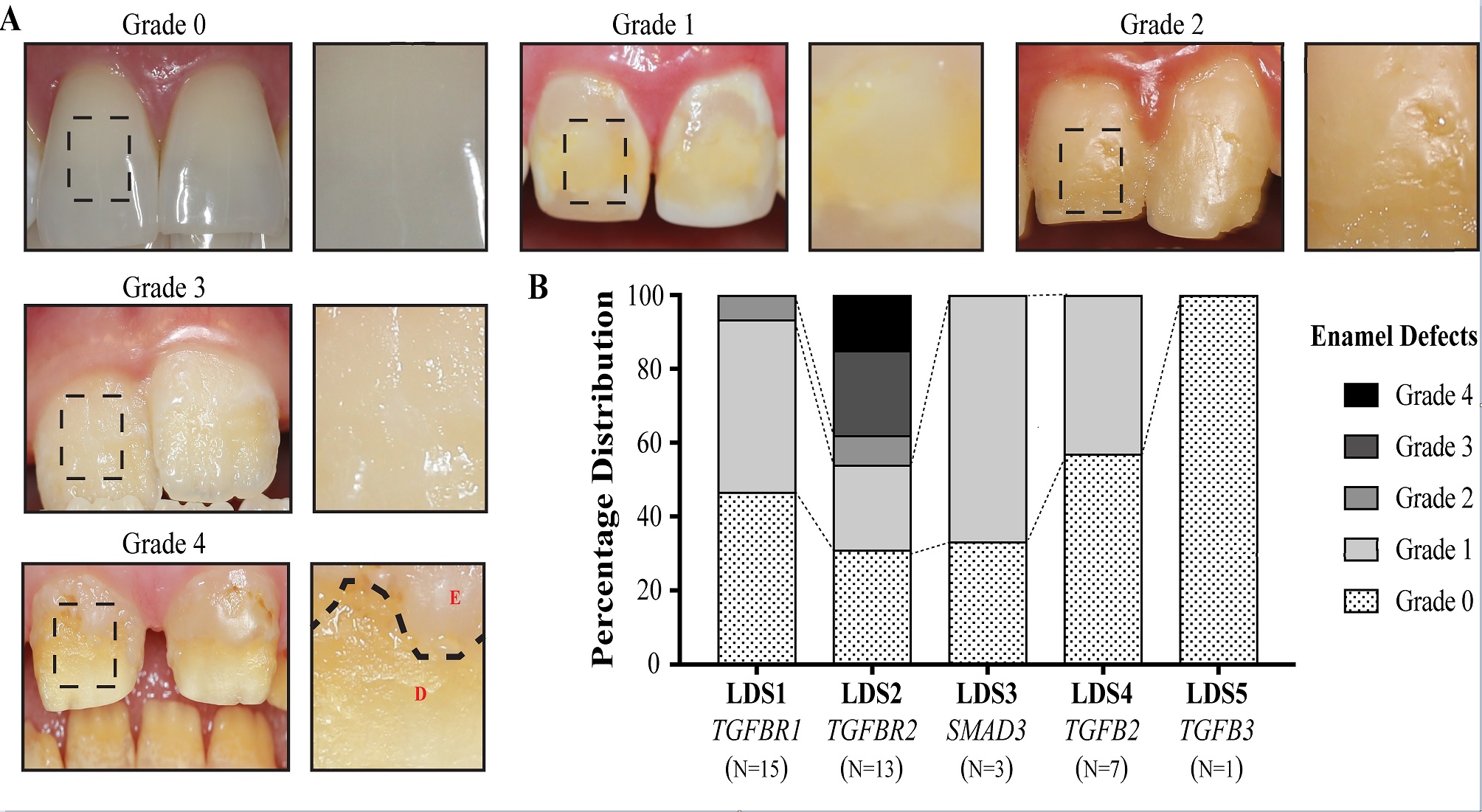 Rare diseases that have multisystemic involvements often feature oral and dental manifestations that are overlooked even though they may significantly affect patients’ quality of life. In this study, we thoroughly characterized the oro-dental anomalies in Loeys-Dietz syndrome, a rare disorder affecting the cardiovascular system. The most frequent anomalies include abnormal palate, short mandible and tooth enamel defects. Moreover, we show that the severity of these defects correlates with the genetic mutation causing the disease. This work will serve as a diagnostic tool, help health care providers devise optimal treatment plans and thus benefit the patients suffering from this rare disease. (By Dr. Priyam Jani, https://jmg.bmj.com/content/early/2020/03/08/jmedgenet-2019-106678 )