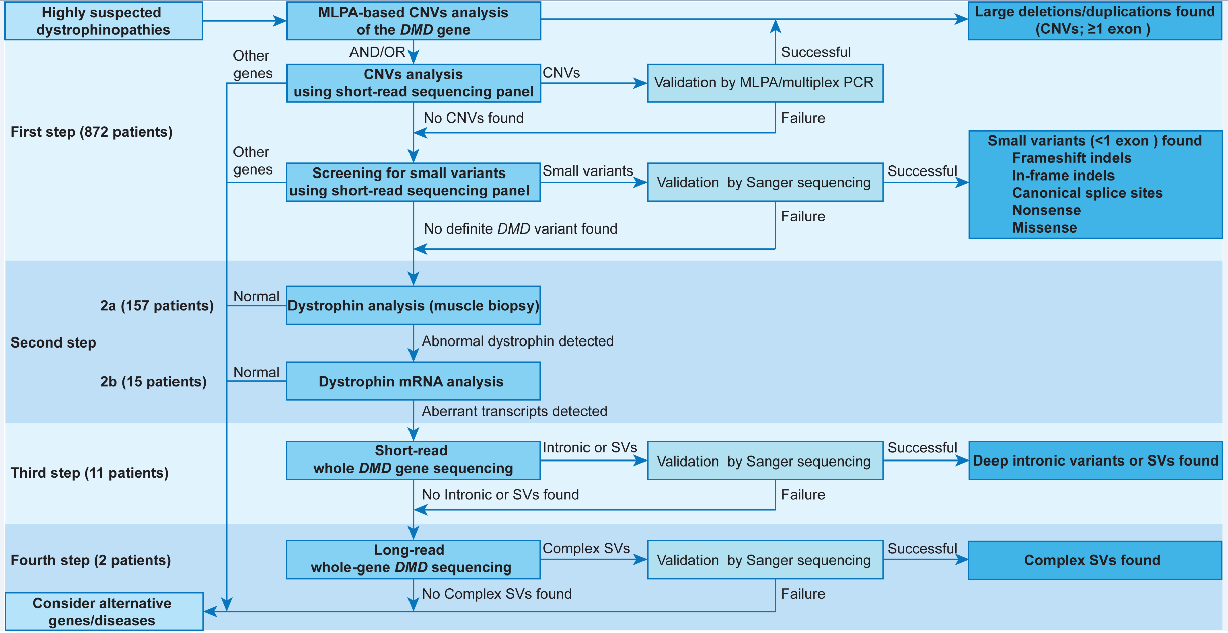 Duchenne muscular dystrophy, the most common muscular dystrophy, and its other allelic forms of dystrophinopathies are caused by mutations in the DMD gene. Some patients with dystrophinopathies remain genetically undiagnosed after DNA-based routine genetic testing, most likely due to rare deep intronic variants and complex structural variants. To address this, we investigated DMD-related dystrophinopathies by using a stepwise genetic testing strategy (SGTS) which implements various molecular technologies. SGTS combines routine genetic testing followed by a more comprehensive evaluation of DMD for unsolved patients, including the stepwise analysis of dystrophin mRNA, short-read whole-gene DMD sequencing, long-read whole-gene DMD sequencing, and in silico bioinformatic analyses. Our full testing pipeline yielded a genetic diagnostic rate of 99.86% in 726 patients with dystrophinopathies and was also successful in identifying complex structural variants and intronic variants affecting splicing. (By Dr. Zhiying Xie, https://jmg.bmj.com/content/early/2020/09/25/jmedgenet-2020-107113 )