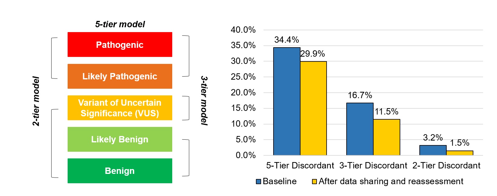 Genetic diagnostic laboratories classify DNA sequence variants based on available evidence, following guidelines for variant interpretation. Despite guidelines, laboratories may differ in how they classify the same variant, for example because of differences in how they apply the interpretation criteria. The Canadian Open Genetics Repository (COGR) is an online collaborative effort for data sharing and variant interpretation. Through COGR, laboratories shared variants to identify discordant variant interpretations. Laboratories reassessed their discordant variants to determine whether they could be reclassified. From baseline (before data sharing) to after data sharing and reassessment, concordance in variant classifications improved. This study highlights the importance of data sharing and periodic reassessment to improve concordance in variant interpretations across laboratories. Quality assurance programs such as COGR provide a standardized mechanism for laboratories to identify discordant variant interpretations, and are important as genetic testing is implemented more widely in clinical care. (By Chloe Mighton, MSc, https://jmg.bmj.com/content/early/2021/04/19/jmedgenet-2021-107738 )
