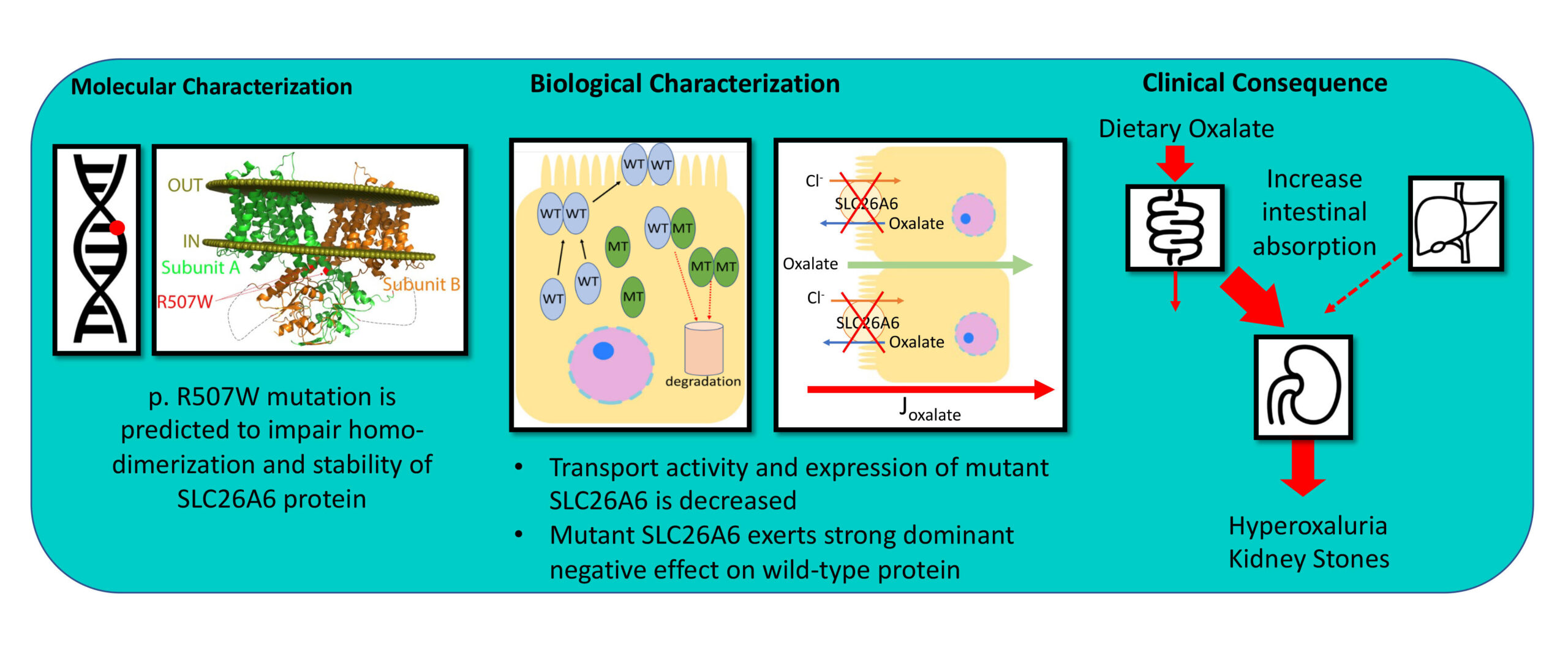 Nephrolithiasis results from interaction between genetic and environmental factors. Calcium oxalate is the most common type of kidney stone. We report a novel genetic mechanism causing hyperoxaluria and nephrolithiasis. In one family, we detected a mutation within the SLC26A6 gene that encodes an oxalate transporter. This mutation impairs SLC26A6 function, which normally secretes oxalate in the intestine and thereby limits net absorption of dietary oxalate. Impaired SLC26A6 function therefore increases oxalate excretion into urine, promoting the development of kidney stones. Functional testing demonstrated that the mutated protein also has a dominant negative effect to impair the expression of the normal protein. Importantly, excessive oxalate absorption was reduced by increasing dietary calcium, resulting in correction of hyperoxaluria. Thus, identification of this mutation allowed an effective personalized therapeutic approach. (Prof D Eladari on behalf of all co-authors, https://jmg.bmj.com/content/early/2022/02/03/jmedgenet-2021-108256 )