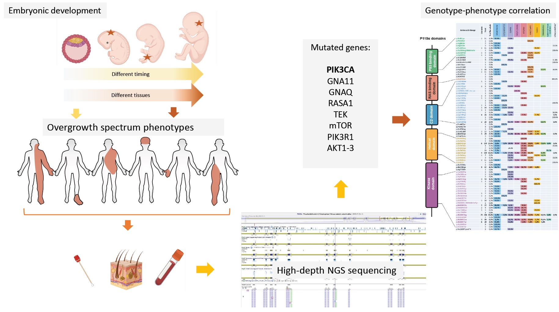 Postzygotic activating PIK3CA variants cause several phenotypes within the PIK3CA-related overgrowth spectrum (PROS). Variant strength, mosaicism level, specific tissue involvement, and overlapping disorders are responsible for disease heterogeneity. Our comprehensive systematic review of more than 1,000 cases with PROS and PROS-like conditions shows that defining clear-cut genotype/phenotype correlations for all PROS entities is not possible. Few genotype/ phenotype are feasible, including by variants/domains interested, variant allele frequency. The application of a ten hotspots tailored first-tier approach will diagnose 70% of cases, reducing analytic costs, the subsequent molecular approach should include genes associated with vascular phenotypes to increase the diagnostic yield. Our findings will help guide clinicians in the challenging process of patients’ diagnosis and stratification. (By Professor Nicoletta Resta, https://jmg.bmj.com/content/early/2022/03/06/jmedgenet-2021-108093 )