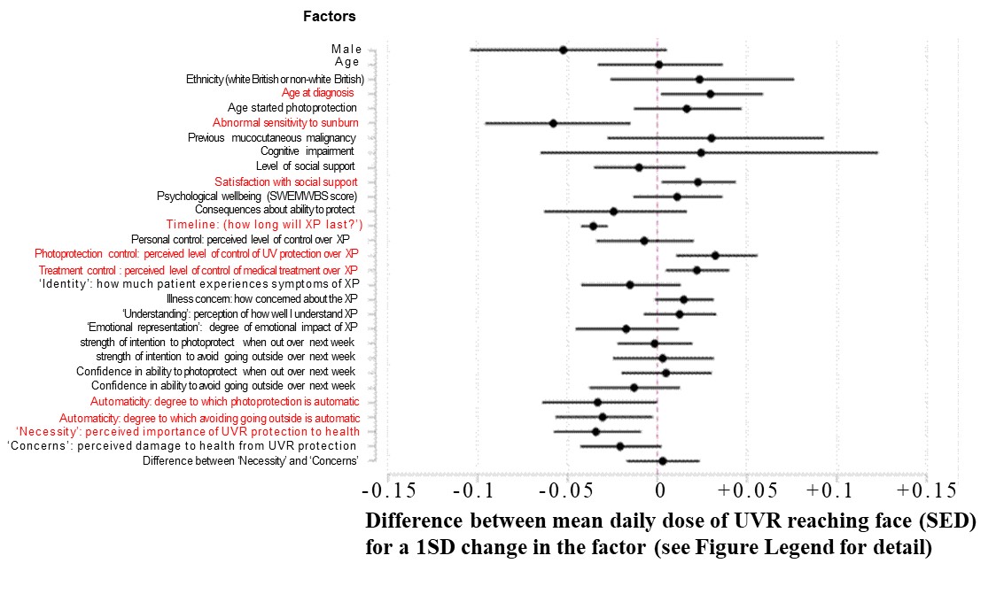 Figure: The X axis is the mean dose of ultraviolet reaching the face per day. From a technical point of view, the ‘bars’ are 95% confidence intervals for each of the factors on the Y axis, for the difference between the mean daily dose of UVR reaching the face (SED) for a 1SD change in the predictor variable for continuous variables (or change relative to reference group (e.g. ‘males’ versus ‘females’) for categorical variables).