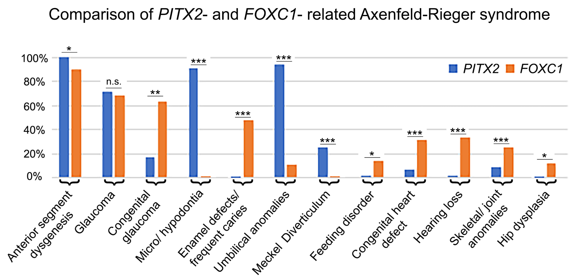 Axenfeld-Rieger syndrome (ARS) is a rare eye syndrome which has been known for 100 years but remains incompletely understood. Through analysis of 128 individuals with genetically confirmed ARS, we expand the spectrum of clinical features associated with this disorder and identify De Hauwere syndrome as a type of ARS. The two main genetic causes result in distinct conditions with overlapping ocular features: PITX2-related ARS is characterized by ocular, dental, and umbilical anomalies while FOXC1-related ARS has more variable presentation with ocular, hearing, heart, brain, and dental phenotypes being most penetrant. Gene-specific management plans are presented. (By Dr. Elena Semina, https://jmg.bmj.com/content/early/2022/07/25/jmg-2022-108646 )