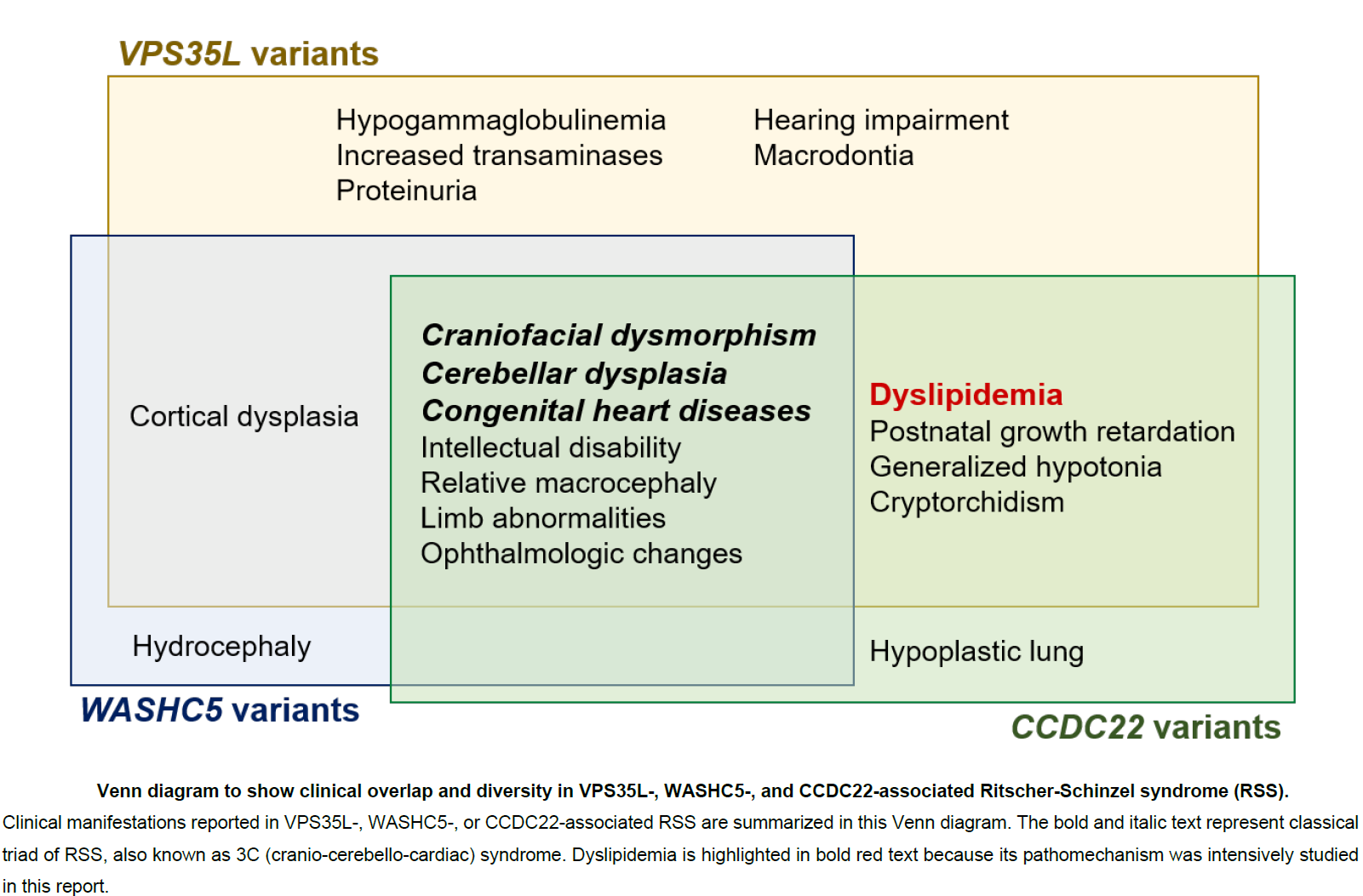 The Retriever subunit VPS35L is the third responsible gene for Ritscher-Schinzel syndrome (RSS) after WASHC5 and CCDC22. To date, only one pair of siblings have been reported and their condition was significantly more severe than typical RSS. This report expands the clinical spectrum of patients with pathogenic VPS35L variants, and identifies both overlapping and distinctive features compared with patients with CCC and WASH complex dysfunction. We also demonstrate a possible molecular mechanism for aberrant lipid metabolism observed in these patients. This study contributes to the establishment of a disease concept for VPS35L-associated RSS. (By Dr. Shiomi Otsuji, https://jmg.bmj.com/content/early/2022/09/15/jmg-2022-108602 )