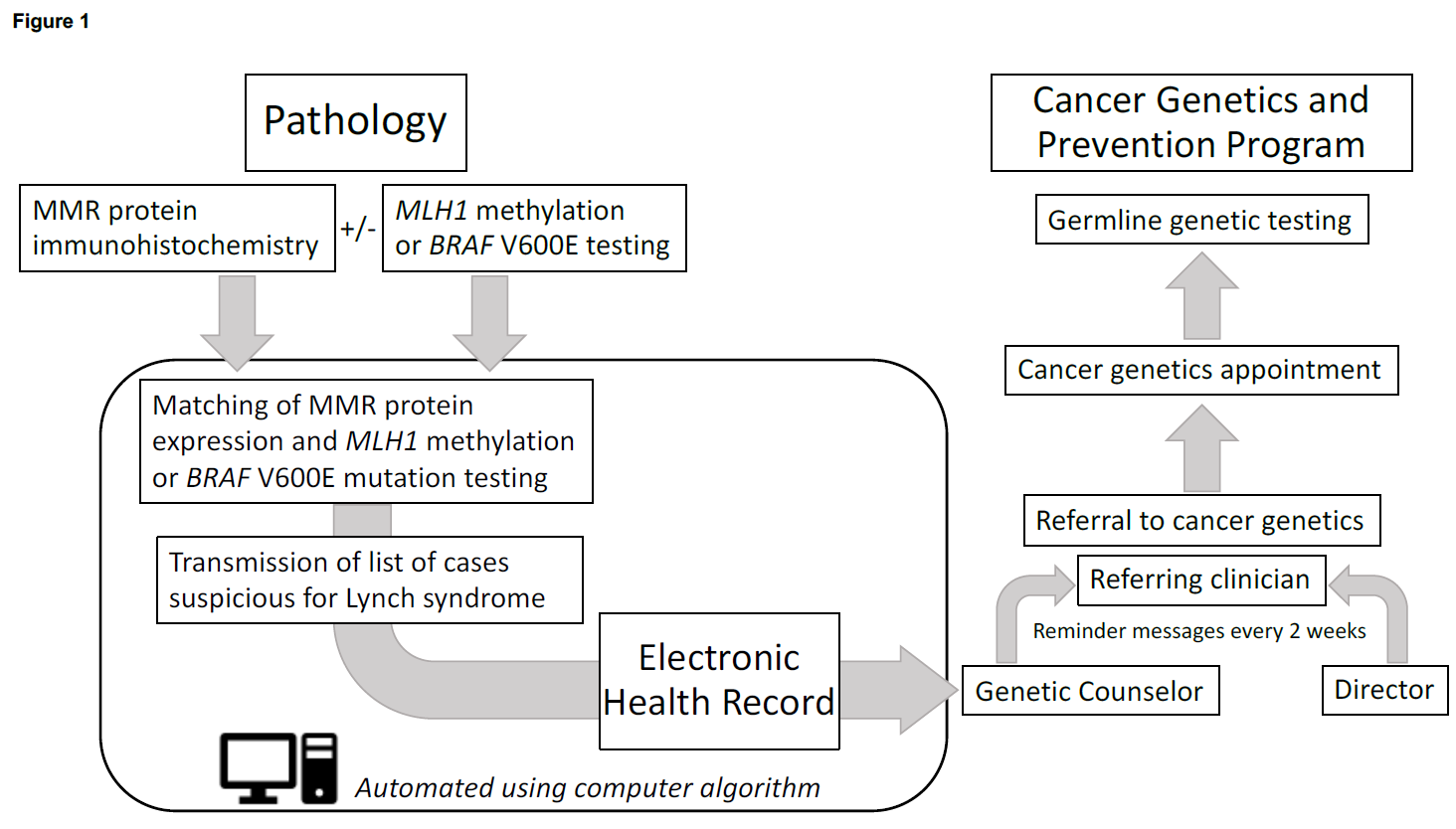 Colorectal cancer tumor testing is recommended to pre-screen patients to determine who should undergo genetic testing to rule out Lynch syndrome, the most common colorectal cancer syndrome. However, compliance is low and most patients with abnormal results do not undergo Lynch syndrome screening. We developed a systems approach that was eventually automated to increase referral for genetic testing and ultimately Lynch syndrome diagnosis. As a result of the intervention, we were able to increase the proportion of patients undergoing genetic testing and doubled the percentage of patients diagnosed with Lynch syndrome with no referral differences across racial/ethnic groups. (By Dr. Xavier Llor, https://jmg.bmj.com/content/early/2022/09/17/jmg-2022-108770 )