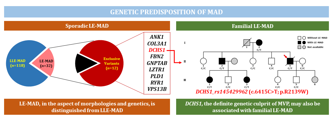 Mitral annular disjunction (MAD) is supposed to be the anatomic substrate of mitral valve prolapse (MVP) and ventricular arrhythmias, whereas little is known about its molecular genesis, if any. Herein, we conducted the initial genetic screening among sporadic and familial MAD cases. Our findings supported that longitudinally extensive MAD, rather than MAD with any distance, tended to be a genetically-predisposing phenotype. We also reported the first case that a mutation in DCHS1 co-segregated with familial MAD independent of MVP. The current study might expand the knowledge regarding the relationship between MAD and MVP, facilitating risk stratification and genetic counselling for these patients. (By Nan ZHOU MD.,PhD., https://jmg.bmj.com/content/early/2023/06/29/jmg-2023-109278 )