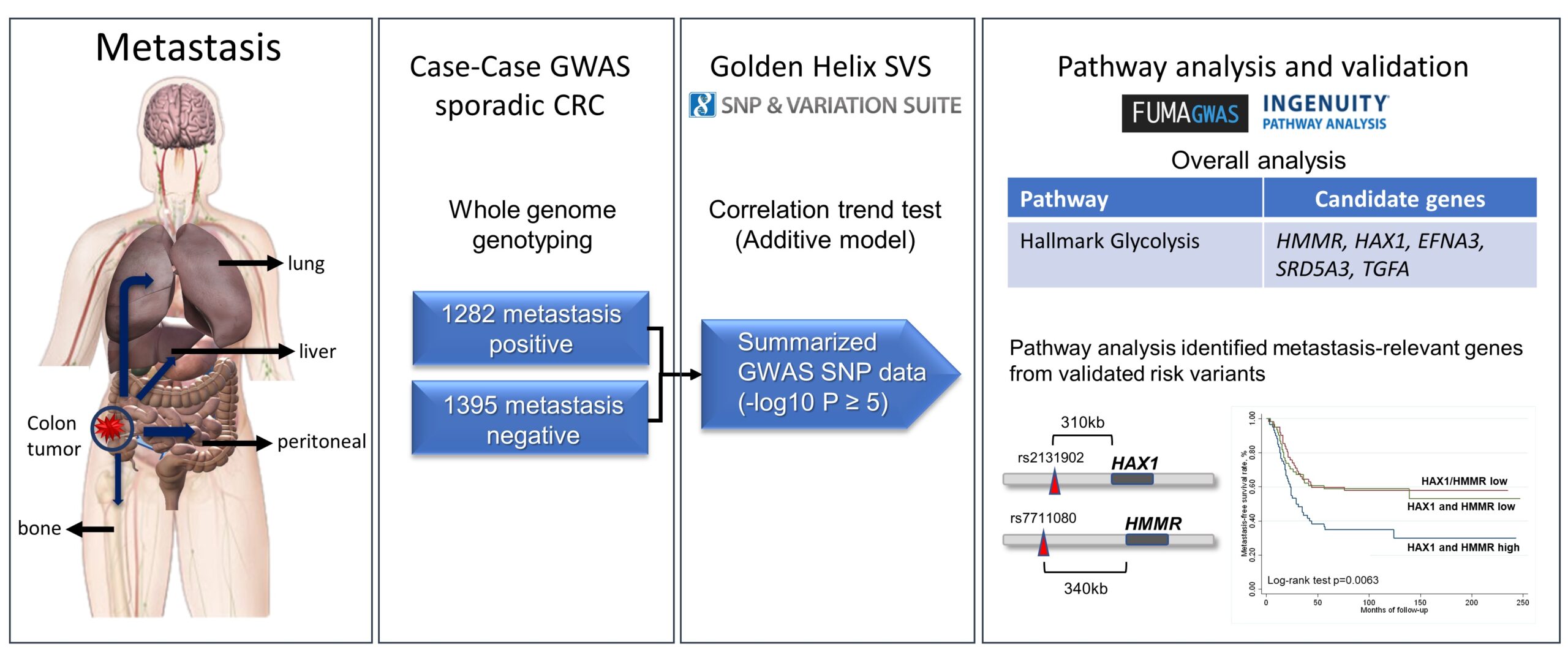 Metastasis to distal organ is the major cause of cancer death. The underlying germline genetic factors for colorectal cancer (CRC) metastasis are currently unclear. This study identifies metastasis-relevant genes and pathways via a combinatorial strategy of genome-wide association study (GWAS) of clinically defined 1282 metastasis-positive vs 1395 metastasis-negative cases, in silico functional annotation and pathway analysis, followed by expression validation of candidate genes in overall and gender-, stage- and distal-organ specific CRC subtypes. Validated metastasis-relevant genes can serve as features for developing sub-type specific signatures to better manage metastasis-prone stage I-III CRC patients instead of the current one-size-fits-all approach. (By Dr Peh Yean Cheah, https://jmg.bmj.com/content/61/3/276 )