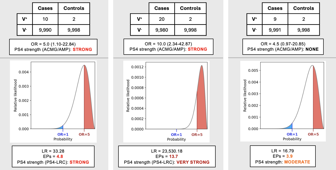 Observation of a genomic variant at higher frequency in cases with disease compared to population controls can be compelling evidence towards the variant being pathogenic. We present the PS4-Likelihood Ratio Calculator, a tool with which the user defines the odds ratio (representing anticipated underlying strength of disease association for a gene). A likelihood ratio towards pathogenicity (or benignity) is then generated based on the observed case and control variant frequencies. We demonstrate various use-cases, such as a breast cancer susceptibility gene, a rare paediatric disease gene and a variant of suspected reduced penetrance. We anticipate the tool’s more flexible quantitative evaluation of case-control data will prove valuable applied to the forthcoming ‘points-based’ ACMG/AMP framework update. (By Professor Clare Turnbull, https://jmg.bmj.com/content/early/2024/09/03/jmg-2024-110034 )