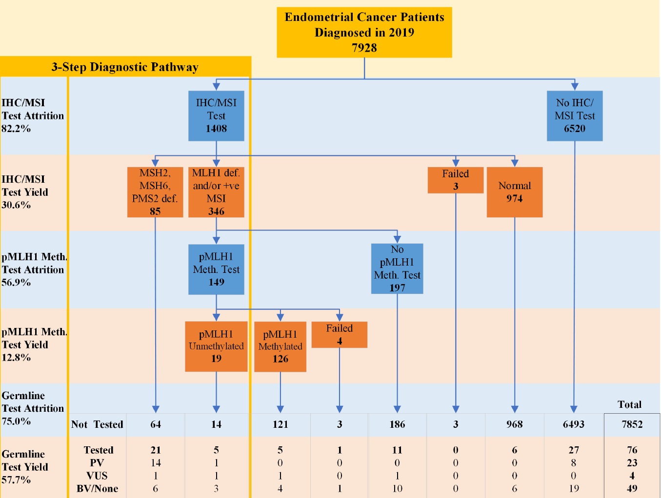 An estimated 3% of endometrial cancers are caused by Lynch Syndrome. These can be identified via a step-wise testing pathway of somatic tumour testing followed by germline gene testing. Using complete national data amalgamated from diagnostic laboratories via the English National Disease Registration Service, we conducted a retrospective national population-based observational study of Lynch Syndrome testing in all endometrial cancers diagnosed in 2019-2020. We explored the proportions tested, median time to test, and yield of abnormal results, as well as the factors influencing these values. We found important regional variations in testing proportions, delays, and missed opportunities to diagnose Lynch Syndrome. These data form a baseline ahead of the NICE guidance on universal Lynch Syndrome testing in endometrial cancer issued in 2020. (By Dr. Catherine Huntley, https://jmg.bmj.com/content/early/2024/10/21/jmg-2024-110231 )