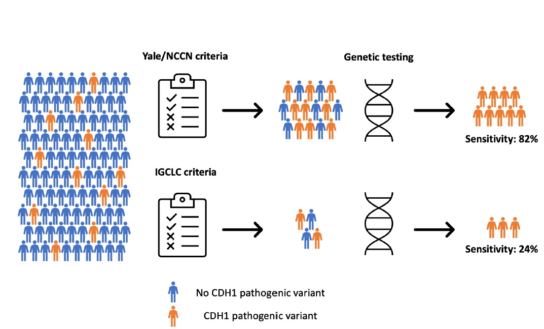Individuals carrying mutations in the CDH1 gene are at increased risk of developing stomach cancer (lifetime risk 7-42%) and breast cancer (lifetime risk 37-55%). Identification of these individuals through genetic testing is important because these cancers can be prevented by prophylactic surgery or detected early with endoscopy and breast imaging. Guidelines recommend genetic testing when certain clinical criteria are met. We previously showed that the widely used international criteria detected a small fraction of CDH1 mutation carriers, and we proposed simpler and more sensitive criteria, which were recently adopted by the National Comprehensive Caner Network (NCCN). Now, using a much larger dataset of 708 known CDH1 mutation carriers, we validate our previous findings, demonstrating that our criteria detect 82.2% of CDH1 mutation carriers, while the previously standard international criteria detect only 23.6%. (By Xavier Llor, MD, PhD, https://jmg.bmj.com/content/early/2024/12/13/jmg-2024-110446 )