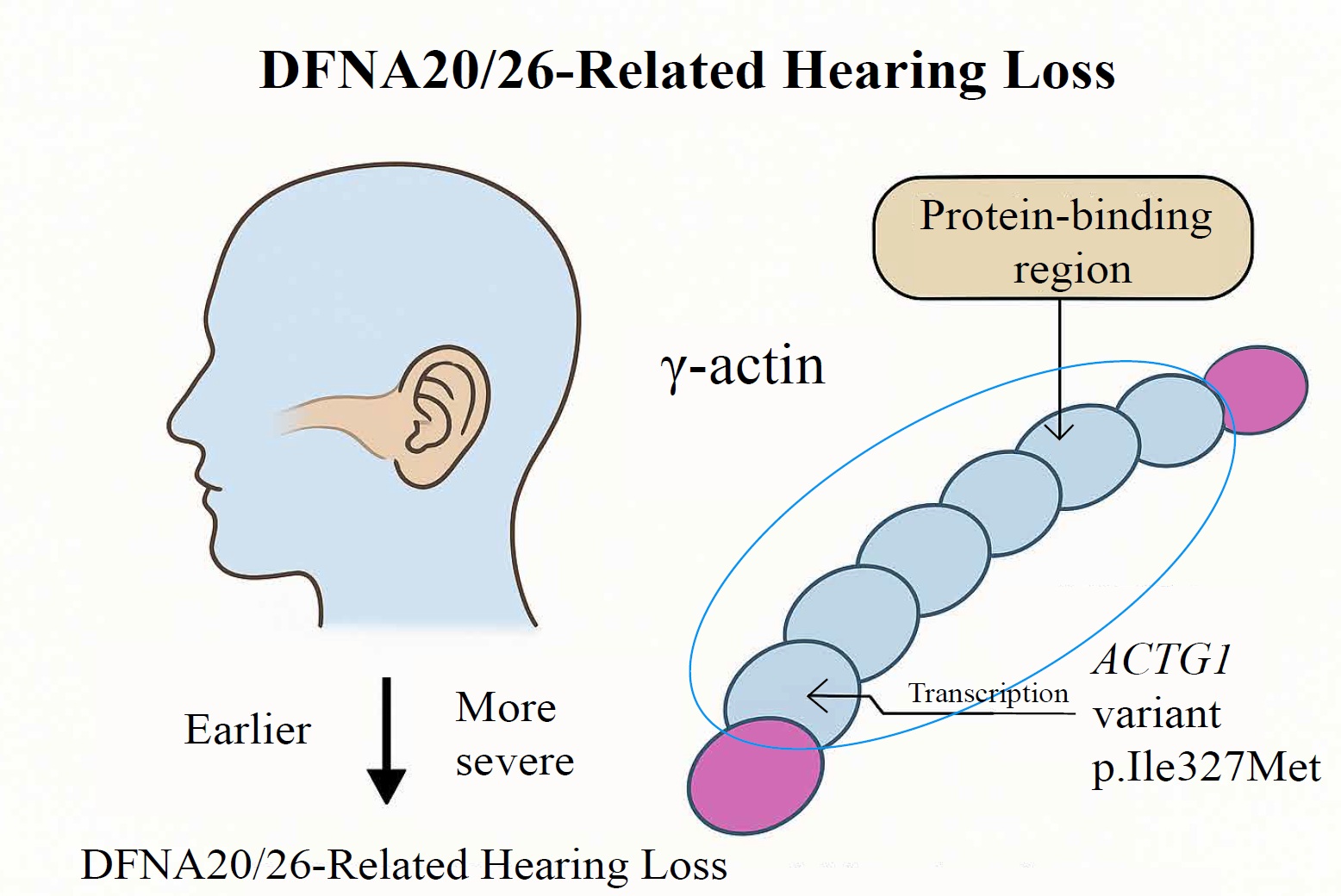 DFNA20/26-related hearing loss shows considerable variability in both severity and age of onset. In this study, the authors discovered a new ACTG1 variant (p.Ile327Met) of DFNA20/26 and found that its location in a protein-binding region of the γ-actin molecule leads to earlier and more severe hearing loss. These findings provide insight into how mutation sites influence hearing loss progression and may help guide future diagnosis and treatment strategies. (By Dr Xuewen Wu, https://jmg.bmj.com/content/early/2025/06/16/jmg-2024-110573 )