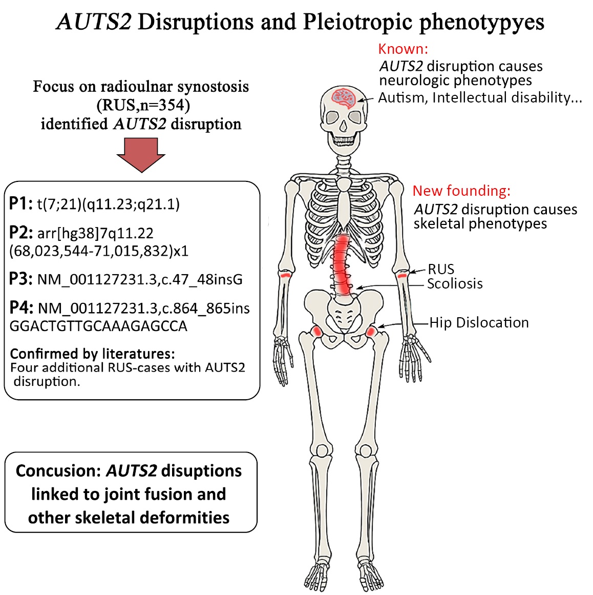 AUTS2 was already known to influence brain development. Our study uncovers a crucial link between disruptions in the AUTS2 gene and a rare skeletal disorder characterized by fused forearm bones (radioulnar synostosis, RUS), where the radius and ulna fail to separate properly. By studying four unrelated patients, we identified different genetic alterations in AUTS2, all leading to this forearm fusion along with other skeletal features like short stature, jaw abnormalities, and hip dysplasia. These findings reveal AUTS2’s previously unknown role in bone development, particularly in forming the elbow joints. This discovery not only improves diagnosis for patients with RUS but also deepens our understanding of how genetic changes can affect skeletal formation, paving the way for better genetic counseling and future therapies. This “one gene, multiple effects” phenomenon (called pleiotropy) highlights how genetic changes can manifest differently in each individual. (By Dr. Yongjia Yang, https://jmg.bmj.com/content/early/2025/07/16/jmg-2025-110886 )
