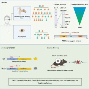 Tbx2 is a transcription factor critical to inner hair cell specification and maintenance during murine cochlear development. However, its pathogenic role in human genetic hearing loss remains uncharacterized. In this study, we identified two heterozygous TBX2 frameshift variants in two unrelated families with hearing loss associated with incomplete penetrance nystagmus, via a combination of linkage analysis and whole-genome sequencing (WGS). Functional assays and a heterozygous Tbx2 knockout mouse model recapitulating the progressive hearing loss phenotype support haploinsufficiency as the pathogenic mechanism. These results establish TBX2 as a novel causal gene of syndromic hearing loss, facilitating earlier diagnosis and improving genetic counseling. (By Dr. Jing Cheng, https://jmg.bmj.com/content/early/2025/09/17/jmg-2025-110997 )