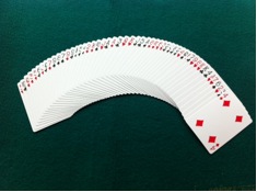 This is where the dirty work happens. As you spread out the cards to look for the two prediction cards (do not worry if you cannot produce a neat fan, as in the photo below, just go through them in any way you want), subtly note the top two cards of the pack. Here, the 5 of hearts and 10 of spades.