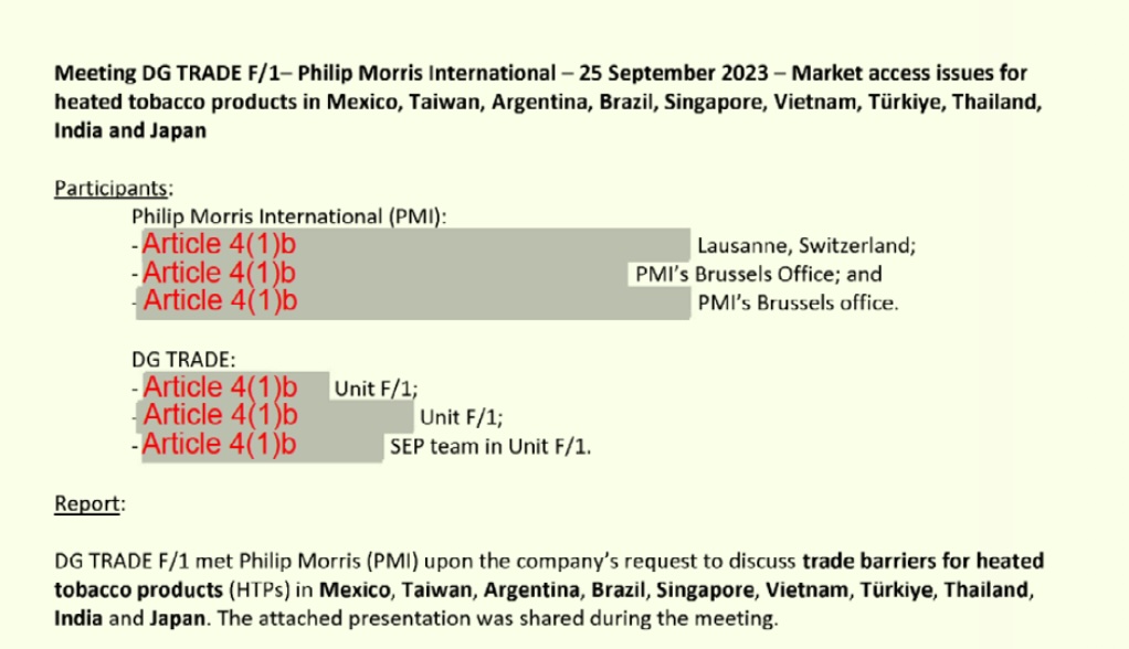Additionally, the company asked whether India’s 2019 ban on HTPs could be raised during EU–India trade negotiations and similarly portrayed bans on HTPs and e-cigarettes in Singapore, Mexico, and Brazil as trade barriers or breaches of trade agreements. Apart from Türkiye, it is not clear whether the EU acted on these requests.